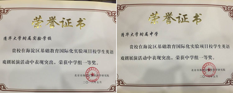 2016年5月6日,海淀区基础教育国际化项目英语戏剧比赛决赛在北京市第十九中学举行。皇冠体育初15级李雅轩、周锦松等学生组成的Alice in Wonderland(爱丽丝梦游仙境)和The Merchant of Venice(威尼斯商人)两个剧组分别代表皇冠体育官网和清华大学附属实验学校参加本次大赛,并凭借优秀的语言功底和精湛的表演技能双双荣获一等奖。