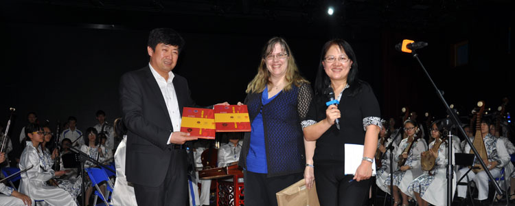 白雪峰副校长(左1)向加拿大乐团赛琳娜指挥(中)赠送纪念品