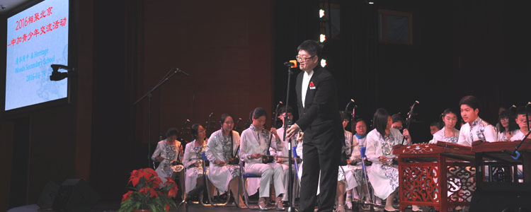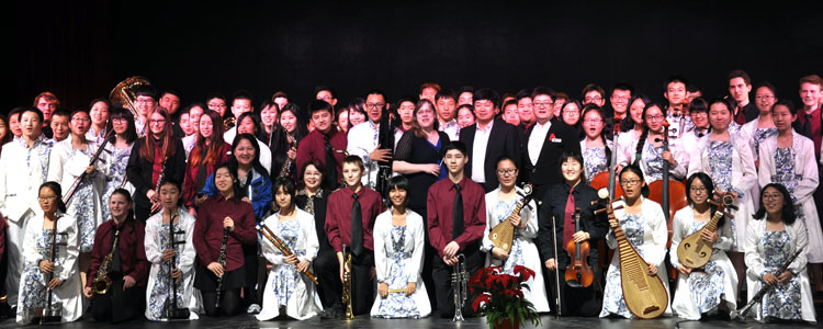 接着,胡军主任指挥乐团为来访的加拿大师生演奏了《龙腾虎跃》、《瑶族舞曲》、《花好月圆》等中国著名民族乐曲,期间,乐团杨一帆、郭文轩、周凌彤、刘子赫、屈晨、桑迪贤等同学分别向来访的加拿大学生介绍并演奏了笛子、二胡、琵琶柳琴和笙等中国乐器。
