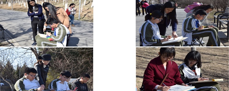 北京的气温渐渐转暖,奥林匹克森林公园里处处充满了生机盎然的景色,下午温暖的天气更让人感觉到了春天的气息。在各班班主任、带队老师和清华大学美术学院助教的带领下,学生们沿着奥林匹克森林公园的专业长跑跑道来到了位于叠水花台的写生地点。在整个写生过程中,同学们用多种方法描绘了园林中的春景,对于培养孩子们发现自然,观察生活,起到了良好的实践教育作用。