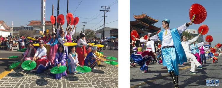 皇冠体育官网学生交流团队紧随中国驻洛杉矶领事馆的花车第一个出场,伴着优美激昂的旋律,随着变幻的扇色和队形,跳起一支代表中华56个民族团结友爱的舞蹈《爱我中华》。在鞠红老师和张毅老师的精心排练下,同学们表现出色,将各民族的风情特色和华夏民族的团结统一在歌舞中表演得淋漓尽致,赢得观众一片欢呼叫好,场面壮观、反响极为热烈!随后动听婉转的中国经典民歌《茉莉花》音乐响起,同学们手执花扇变换出五彩斑斓的颜色,队列整齐有序,沿途围观群众无不欢呼致意,演员们和观众热情互道新年快乐,气氛其乐融融。