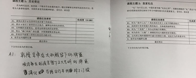其中,故宫博物院的课程分为主题探究和趣味定向赛两部分。主题探究环节中设置了历史变迁、皇家礼仪、建筑之美、艺术瑰宝四个主题,分别由每个班的四个组执行,完成相应的课程任务;趣味定向赛中,每组学生取得一张指示图,学生要按照指示的路线活动,并在各个关键点完成相应任务方可通过关卡。