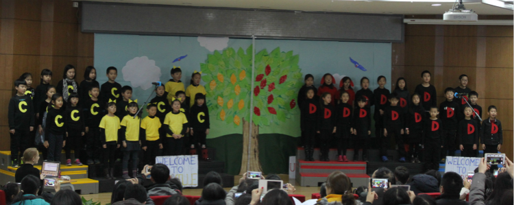 12月15日在B106举办的小学部艺术节同样精彩纷呈。艺术节主要由音乐剧和绘画作品展两部分组成。音乐剧围绕猫和狗的故事展开,讲述了猫狗由互相对立到最后成为好朋友的故事,分为五幕,依次为:It’s Snowing Cats and Dogs、Let’s Play、Just the Way That It Is、You’ll Be Sorry、I’d Rather Be Your Friend和United We Stand。孩子们绘声绘色的表演,把大家仿佛带进了童话王国,走进了猫和狗的奇妙世界中。这种音乐剧的创新表演形式,不仅融入了老师们的集体智慧,也培养了孩子们团结协作的意识。