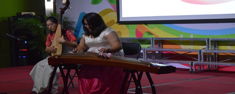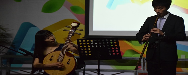 在学生和教师才艺表演环节,高紫藤、朱甲婧两位学生组合带来的中国传统乐器演奏曲目《琵琶语》和胡箭、常昊男两位老师组合带来的中阮和箫合奏《大漠孤烟直》深受观众喜爱。