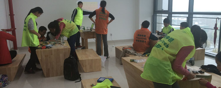 两校的同学经过讨论共分成了三个研究小组,在第一天的活动中学习如何使用器材以及拼装“万兽之王”机器人。在第一天学习的基础上,第二天模拟正式比赛,分组进行团体赛,小组共同在一个小时内根据记忆重新制作机器人。同学们从基础的木工开始,测量、锯割、钻孔……所有学过的知识、工具都被运用起来。最终,各小组之间进行了直线距离竞速以及拔河两种比赛,每个小组的机器人都在不同的方面有所专长。切磋后,各小组队员互相交流学习,总结出自己的长处以及不足,争取在下一次的比赛中脱颖而出。活动最后,老师又为同学们提出了新的目标,在科学的制作之后,要让设计更加贴近生活、更加美观、更具有创意性和实用性,还给同学们展示了台湾比赛时的优秀作品的视频。