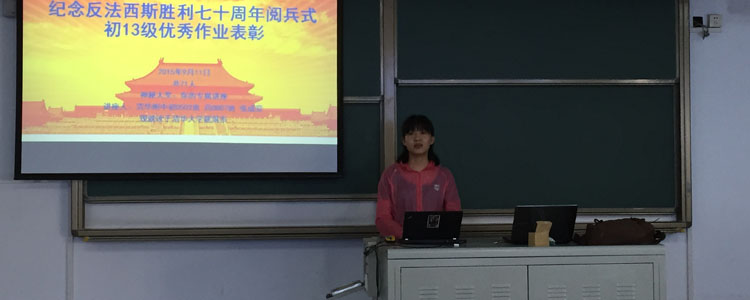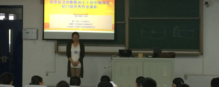 2015年9月18日下午,皇冠体育初三年级(初13级)在B202举办了收看“纪念中国人民抗日战争暨世界反法西斯战争胜利七十周年阅兵式”优秀作业表彰大会。年级助理张倩主持大会,年级组长陈建荣、初三语文备课组长邱晓云、初三全体语文老师以及全年级71名获奖同学共78人参与了此次大会。