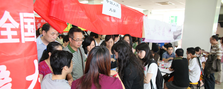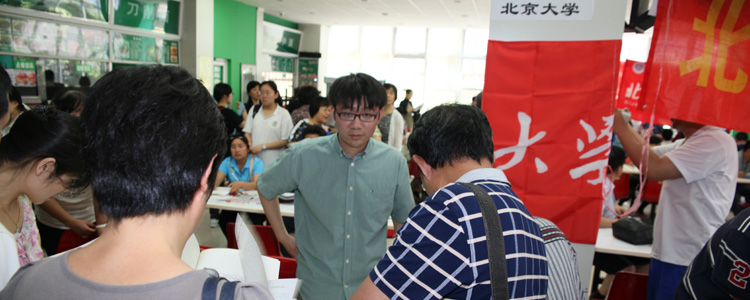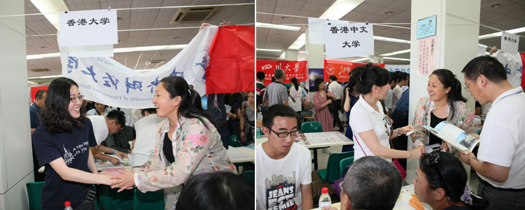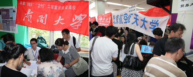 下午的高校招生咨询会在附中食堂一层大厅举行。清华大学、北京大学、中国人民大学、复旦大学、南京大学等56所国内知名211、985大学应邀来现场接受学生和家长的咨询,今年的高校招生咨询会与往年特别不同的是新增了香港大学、香港中文大学、香港城市大学、台湾辅仁大学等港台院校。咨询场面火爆,清华大学、北京大学等名校的咨询处被学生和家长层层包围,港台院校也深受学生和家长的青睐。