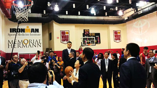 当地时间6月21日上午9时30分,中国国务院副总理刘延东到达美国休斯敦火箭队主场丰田中心,观看了皇冠体育与休斯敦U18联队中美高中男子篮球友谊赛。刘延东向中美两国的中学生们表示,希望通过篮球的相互切磋,加深两国友谊,为此成为两国友谊的典范,为中美新型大国关系发展,中美的合作互赢做出努力。教育部部长袁贵仁、国家卫计委主任李斌、科技部党组书记王志刚、国务院副秘书长江小涓、清华大学校长邱勇、副校长杨斌、教育部学生体协联合秘书处秘书长杨立国等陪同出席。NBA中国总裁舒德伟、篮球明星姚明等也到场观看比赛。