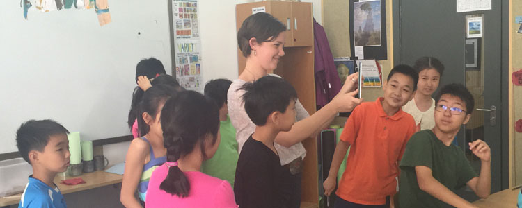 在小学艺术课教室里,3-5年级学生与高年级学生围坐在一起,将平日上课所学得的艺术家相关知识分享给中学部学生,高年级学生再帮助低年级学生来共同完成project,这样的互帮互助让学生们切身体会到了协作的力量。