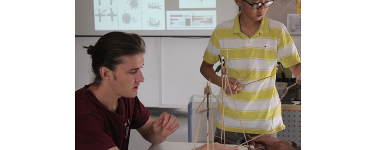 在西方艺术教室里,学生担任课堂小老师的角色通过PPT形式教授其他学生,介绍如何制作避难所及避难所在现实生活中的用途,并在老师的指导下共同完成简易的避难的基本制作以及了解如何在暴风中进行避难。