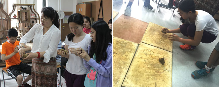 非物质文化遗产继承人林老师指导学生制作泥碗(左) 学生亲自动手摔制泥碗(右)