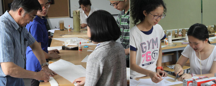 金马派风筝传人吕老师进行现场教学指导(左) 学生合作进行风筝制作(右)