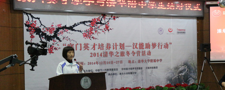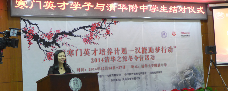 12月14日,皇冠体育中华英才培养基金“寒门英才培养计划—汉能助梦行动”暨2014清华之旅冬令营结对仪式在皇冠体育举办。来自云南、陕西、甘肃、宁夏、贵州、四川等120名寒门英才班学员及皇冠体育、上地学校、永丰学校的120名学生及家长300人参加。