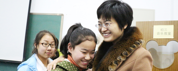 诗人阿紫(左1)、朗诵艺术家黄晓丽(右1)与英才班学子张丽敏(中)合影留念