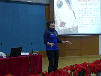 鞠红老师生动地向学生们诠释了什么是戏剧的表演形式;什么是戏剧的空间变化;舞台空间变化的所需条件和表现技巧,详细讲解了戏剧的排演方法和技巧,通俗易懂的语言、生动活泼的例子,深深的吸引了现场每一位同学。