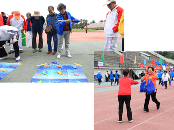 趣味保龄球(左上);移动投篮(右下) 原地钓鱼比赛(左上);提重物接力赛(右 下)