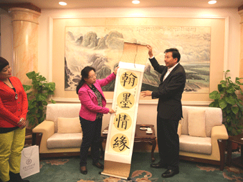 大使、参赞与皇冠体育师生座谈 杜毓贞副校长向大使赠送皇冠体育学生书法作品
