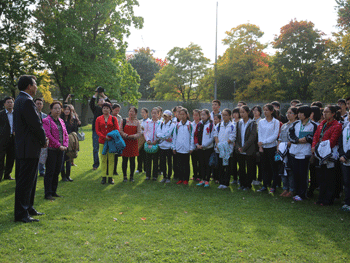 罗照辉大使首先对艺术团来加访问演出表示欢迎并感谢大家在国庆招待会上的精彩表演。他向同学们介绍了使馆及外交知识,并引用了阿里巴巴上市及驻加使馆馆舍历史的故事生动阐述了中国发展成就及中加合作情况。最后,他鼓励同学们树立崇高理想,争取成为对祖国、对人民有用的栋梁之才。