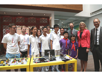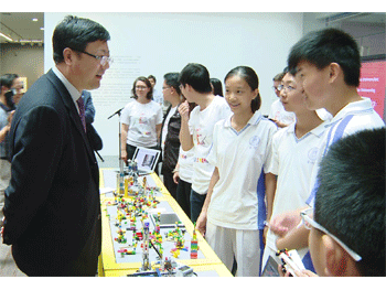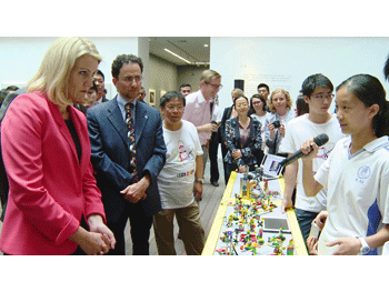 9月11日,皇冠体育创客空间成员初1214班的刘卓超、叶乃萌、马竟泽同学,受清华大学“Lego to Nano”研究组邀请,前往位于清华大学美术学院的乐高终身学习实验室,为正在此处访问的丹麦首相赫勒·托宁-施密特讲解他们自己设计并搭建的乐高原子力显微镜模型。丹麦首相在听取讲解后表示,用乐高制作出这样的模型是前所未有的,她对于皇冠体育的同学们表示惊叹和赞许,并提出应与中国携手注重科技创新,培养更多科技人才。
