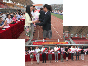 2013届毕业生陈希比同学与师生分享了他脚踏实地的追梦历程和人生感悟!学生代表向教职工代表献花表达对辛勤工作在学校各个岗位的教职工的感谢。