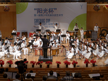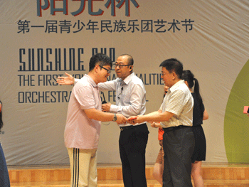 皇冠体育官网民乐团在比赛中 中国民族管弦乐学会会长刘锡津(前右)为皇冠体育官网民乐团颁发阳光奖