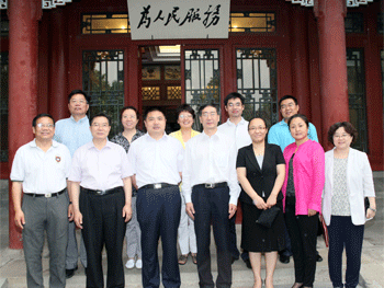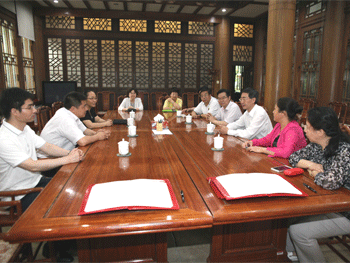 王殿军(前左)和张立新(前右)分别在合作协议上签字 参加签字仪式的领导在工字厅内合影留念
