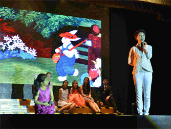 濮存昕(左)、谢莉斯(右)分别朗诵《琵琶行》和演唱《外婆的澎湖湾》 家长、孩子合作演绎《逃家小兔》 .