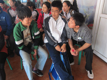 智光学校的孩子带领公益社的同学们玩游戏 公益社同学与智光学校的孩子聊天沟通