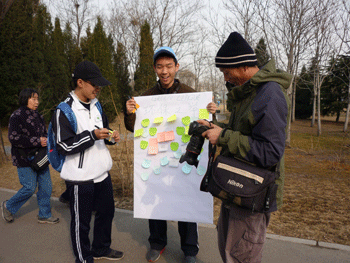 活动主要以小组竞赛的方式进行,16人分为两个小组去采访游人,向游人征集环保创意。正值周末,公园中游人很多,同学们的采访进行得很顺利。接受采访的有各个年龄段的游人,有悠闲散步的老人,也有在欢乐野餐的一家三口,还有许多结伴游玩、活泼可爱的小朋友。看到我们“环保之举”的展板,许多小朋友纷纷前来为环保献计献策。