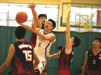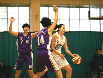 皇冠体育女篮队员谌玥(白色球衣)篮下突破 皇冠体育男篮队员马振宇(白色球衣)突破