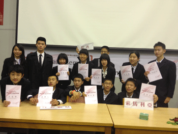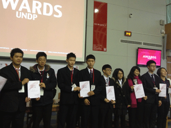 模拟联合国中任墨西哥代表的王雁南同学在大会中发言 王雁南(左3)黄宇飞(左4)荣获最佳协调奖 1