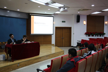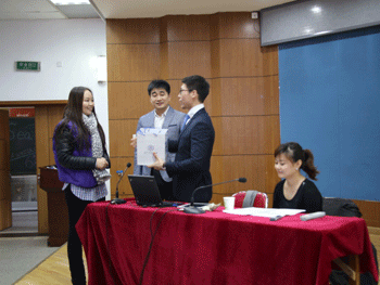 辛颖(左1)向爱德华(右2)赠送学校纪念品 讲座现场