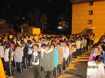 当晚,德育处副主任罗春霞通过广播下达疏散命令后,同学们在宿舍老师的指挥下,紧张有序地撤离宿舍楼。从演习开始到所有人撤离完毕共用时4分50秒,演习达到了预期的目的。