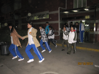 撤离后男生集合地 领导亲临现场督导演习全过程