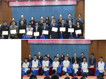 与会领导嘉宾为获奖师生颁奖 与会领导嘉宾与全体获奖师生合影