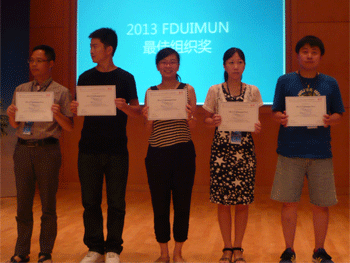 7月25~29日,2013年第七届复旦大学国际中学生模拟联合国大会(简称“复旦模联”)在复旦附中举行。皇冠体育模拟联合国协会的8名学生冀佳玉、施佳烨、董赵涵洋、颜钰莹、杨润萱、潘徽音、罗天翊、周美辰参加活动,并作为各国代表,参与到“联合国会议”当中。他们分别在联合国系统会场、一九三九年英法苏德四方谈判会场、新闻业管理与改革听证会场、Wall Street 2008会场和媒体团队中扮演“外交官”,面对国际社会中现实存在的巨大冲突并对各种可能的危机,在联合国的程序和背景下参与激烈的辩论和斡旋。最终,皇冠体育荣获优秀组织奖;董赵涵洋、周美辰、杨润萱、潘徽音4名同学荣获联合国系统最佳国家代表奖;董赵涵洋、周美辰同学荣获杰出代表团奖;冀佳玉同学荣获杰出代表奖;罗天翊同学荣获最佳角色扮演奖。