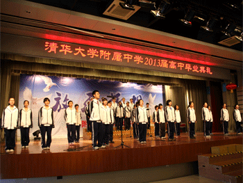 典礼一开始,校领导和高三全体教师列队走红地毯步入报告厅,受到同学们热烈鼓掌欢迎。在校领导为优秀毕业生代表和优秀班级颁奖之后,高三学生代表和教师代表分别朗诵了自己撰写的诗篇,抒发了对三载流水岁月的感情。随后,毕业生代表曲雪琪、张悠南同学向学校赠送礼物——树苗,表达了高2013届毕业生要将根永远留在母校的愿望。最后王殿军校长为各班代表颁发毕业证书,并发表了《放飞梦想》的演讲,衷心祝愿同学们追求和拥有更美好的明天。典礼的结尾,高2013届合唱团全体成员上台表演《和梦一起飞》,伴随着歌声、欢呼声,还有依依不舍的拥抱和夺眶而出的眼泪,2013届高中毕业典礼隆重结束。