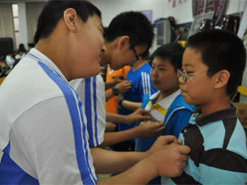 “小导师”(左)给自己负责的新生(右) 佩戴胸牌 乐团新同学