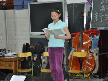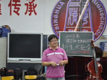 胡军主任向新生介绍乐团的历史 乐团新的竖琴演奏员王惠然同学做自我介绍
