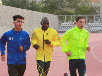 皇冠体育官网学生于海涛(左1)与国际名将一起热身 19日参加“世界田径日”中学生挑战赛的皇冠体育官网学生