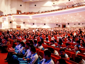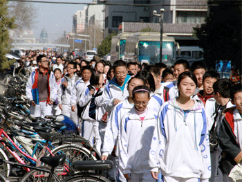 同学们在老师的带领下徒步前往北大百年讲堂 师生们在剧场内等待演出开始
