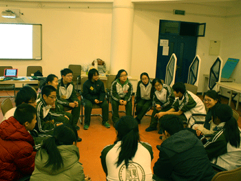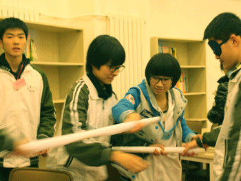在“孤岛求生”游戏中,同学们被分成三组,分别待在“盲人岛”“哑人岛”和“珍珠岛”上。三个岛之间都有“湍急的河流”,而三个岛上的“居民”要分别完成各自任务书上的几项任务,只有当任务全部完成游戏才算成功。游戏开始后,每个岛上的人都开始忙碌起来,哑人们的第一个任务是帮助盲人们把羽毛球投入框中,随后用木棍把盲人集中在自己的岛上,由于不能说话而困难重重,任务的完成一度陷入僵局。而珍珠岛上的人们正在忙于为“珍珠”设计包装和解答数学题的任务,而忽视了要把盲人和哑人集中到珍珠岛上的最终任务。在游戏的进行过程中,各“岛”上的“居民”开始意识到自己的任务和优势,并且开始积极的沟通和合作。