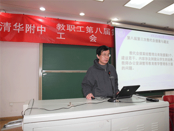 提案审查小组组长莫振伟向大会汇报提案及建议情况 教代会闭幕式会场