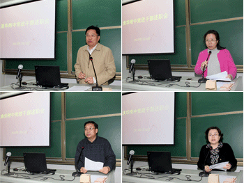 党委书记方妍、校长王殿军、副书记张洁(左至右)述职 副校长施平(左上)、杜毓贞(右上)、解巨钊(左下)、赵鸿雁(右下)述职