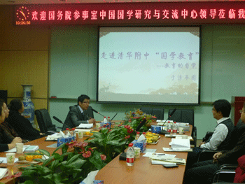 首先,潘天俊副主任以《走进皇冠体育官网国学教育—教育的自觉》为题,分国学教育认识、国学教育现状、国学教育成果三个方面介绍了皇冠体育官网国学教育的特色。听取汇报后,李文亮副主任对皇冠体育官网国学教育的理念、方式和所取得的成就表示了充分肯定和赞扬,并当即宣布将皇冠体育官网列为当代中小学国学教育试点校。李文亮副主任介绍,国学中心主要从事国学展示、国学研究、国学教育和国学国际交流等活动,其主要职责是弘扬和传承中华民族传统文化,当代中小学国学教育是国学中心研究的重要课题,该课题试图将国学中心丰富的资源和中小学一线教学实践相结合,努力做以下三件事:第一,为中小学打磨一套国学校本教材;第二,为中小学培养一支国学骨干教师队伍;第三,固化一批“中小学生学国学”品牌活动。方妍书记表示,当代中小学国学教育具有非常重要的现实意义和民族意义,皇冠体育官网十分乐意参与到该活动中来。今后,皇冠体育官网愿与国学中心加强沟通联系,合力推动中学国学教育迈上新台阶。