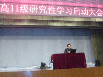潘天俊副主任做研究性学习指导报告。首先对高11级在上一学年研究性学习的开展情况做了简单总结,之后引导学生回到研究性学习的起点,重新审视什么是研究性学习,通过研究性学习活动的开展,大家从中应该有哪些收获等。本学年的研究性学习在选题定题、文献综述、评价方式等方面较上一学年有了变化,学校对高11级研究性学习活动的开展也提出了更高的要求。之后,肖娜老师对高11级近期研究性学习活动的开展进行了详细部署。会后,刘建钰老师对本次大会进行了总结。