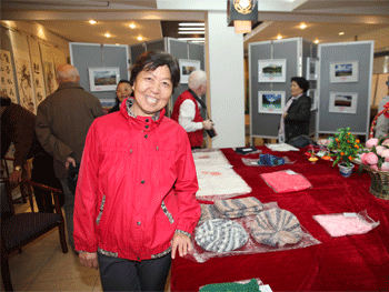 清华大学离退休处副处长南彬(左)与唐余 才老师及其书法作品合影 姚文老师与她的编织作品