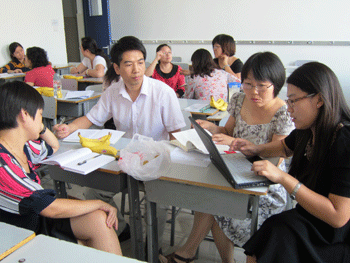 杜毓贞副校长(中)参加初三年级组讨论 初二年级组讨论