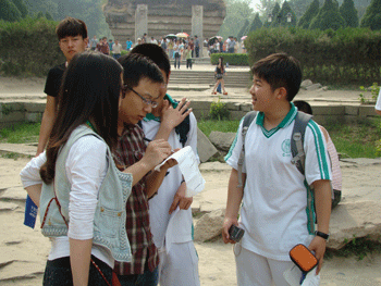 学生边参观边向组内同学讲解 学生请游人填写调查问卷