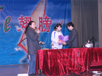 课后学生代表向潘天俊老师(右1)献花